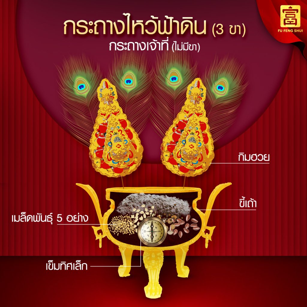 กระถางฟ้า-ดิน : จะเป็นกระถางดินเผา ปูน หรือโลหะก็ได้ แต่จะเป็นกระถางที่มี 3 ขา ซึ่งจะมีลำดับในการทำกระถางฟ้า-ดิน ดังนี้